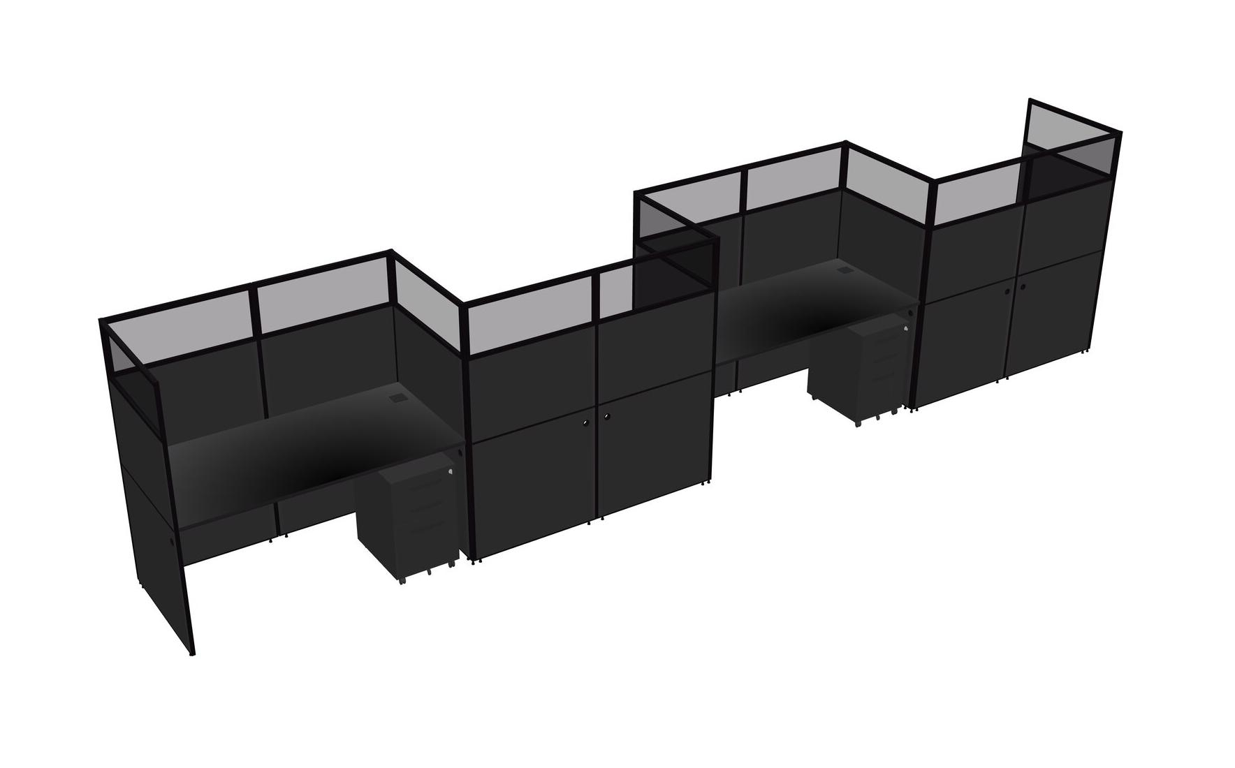 Black Rectangular Cubicle Workstations For 4 - Zigzag Formation + Black Metal Mobile Drawers