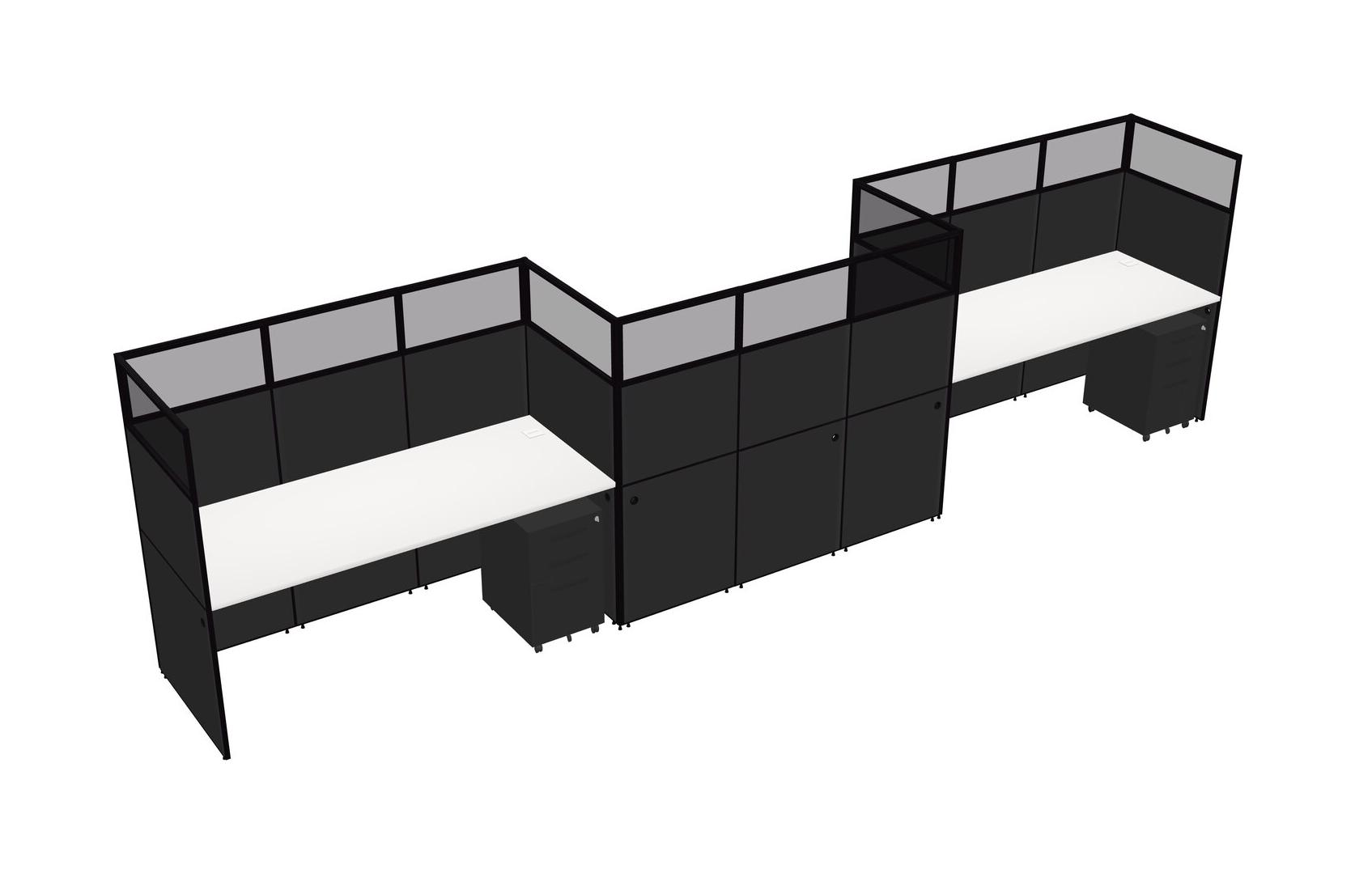 White Rectangular Cubicle Workstations For 3 - Zigzag Formation + Black Metal Mobile Drawers