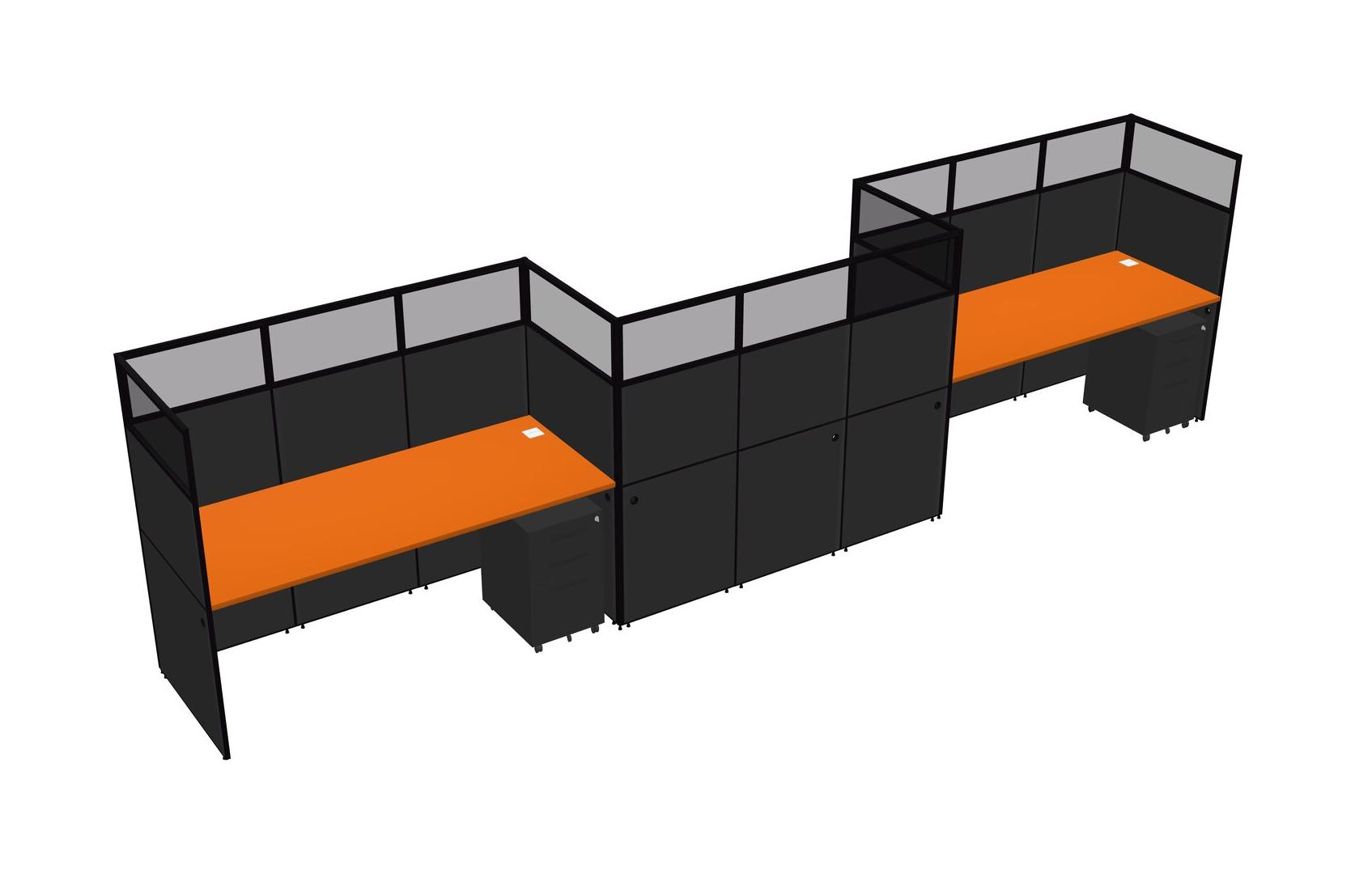 Orange Rectangular Cubicle Workstations For 3 - Zigzag Formation + Black Metal Mobile Drawers