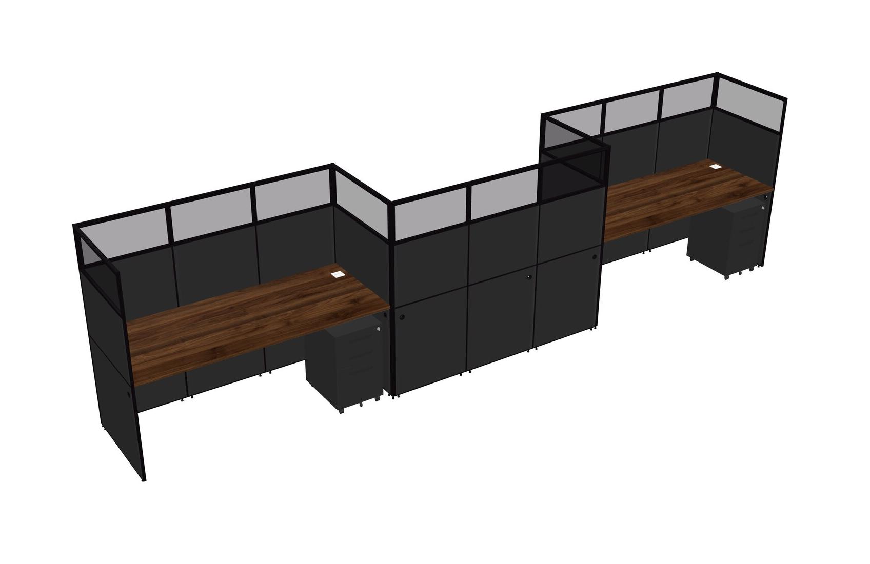 Columbia Walnut Rectangular Cubicle Workstations For 3 - Zigzag Formation + Black Metal Mobile Drawers