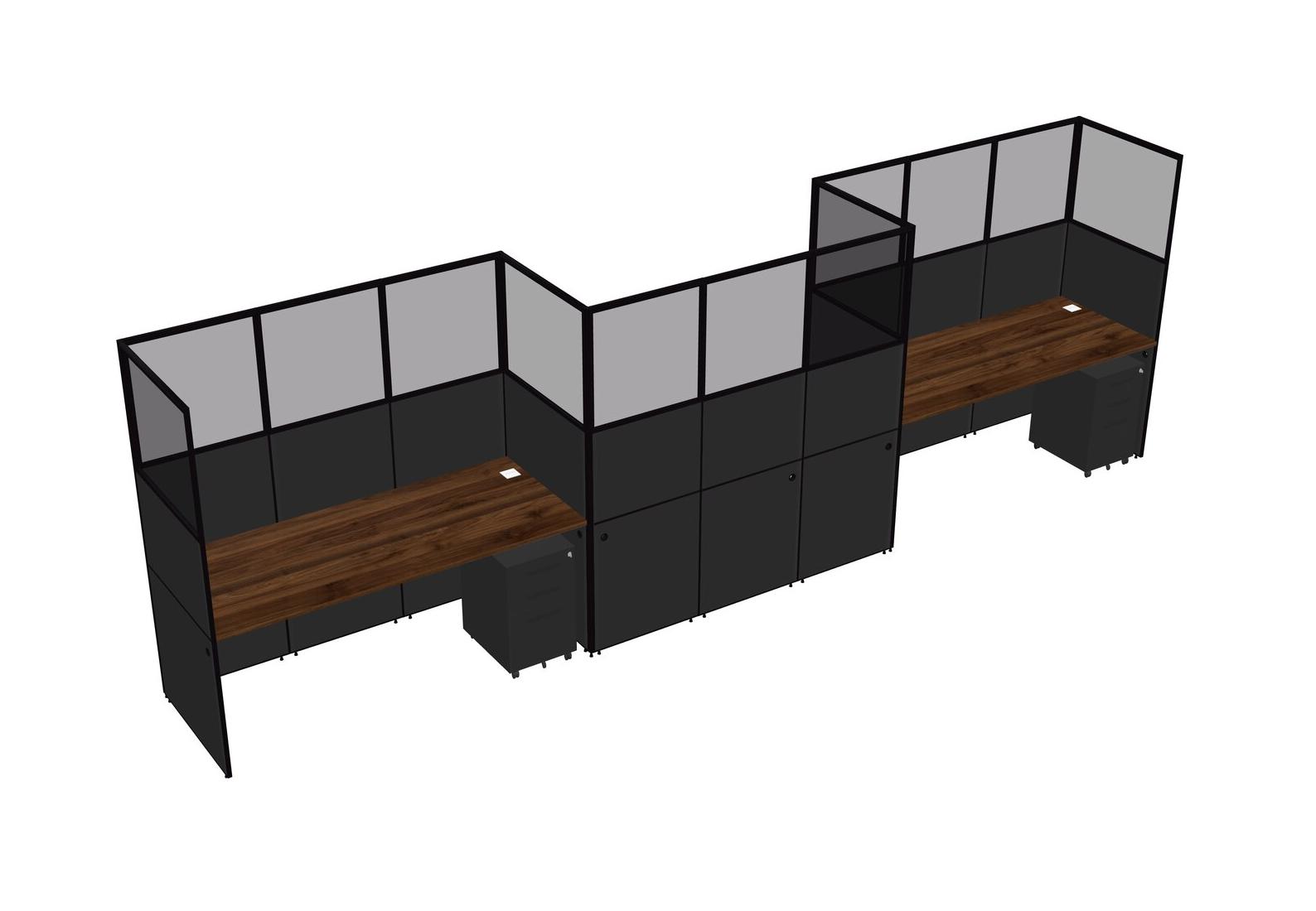 Columbia Walnut Rectangular Cubicle Workstations For 3 - Zigzag Formation + Black Metal Mobile Drawers