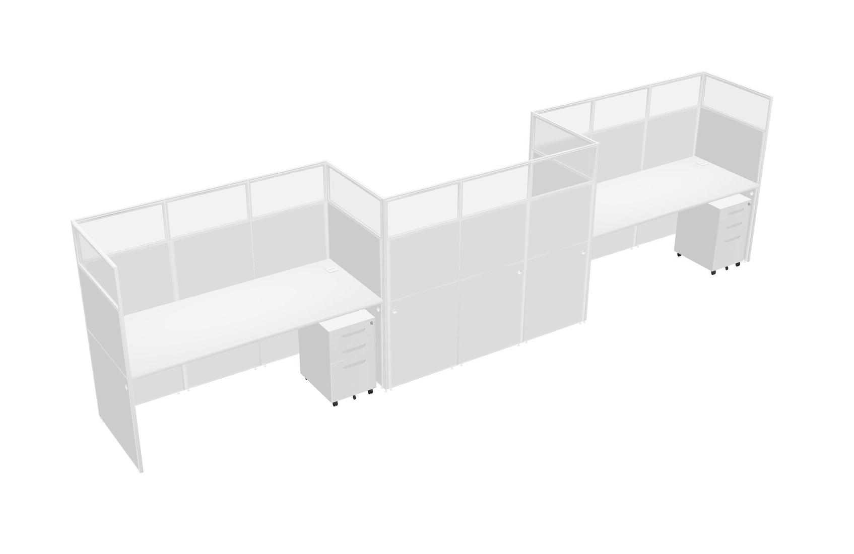 White Rectangular Cubicle Workstations For 3 - Zigzag Formation + White Metal Mobile Drawers