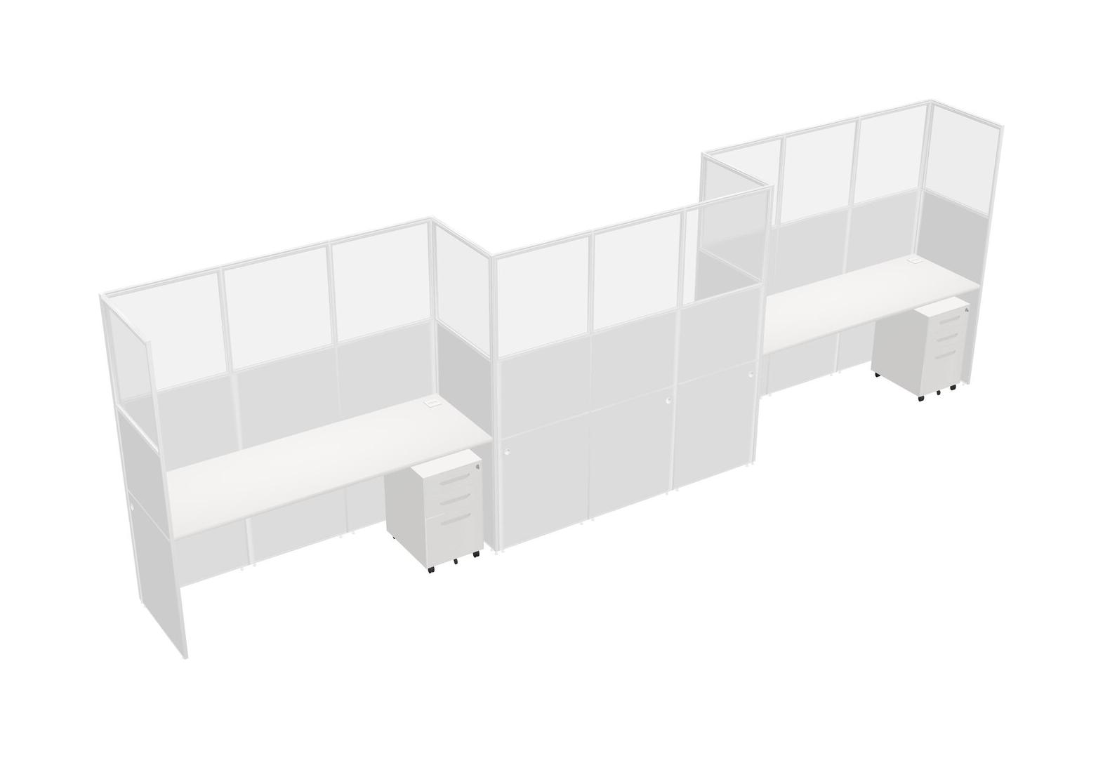 White Rectangular Cubicle Workstations For 3 - Zigzag Formation + White Metal Mobile Drawers