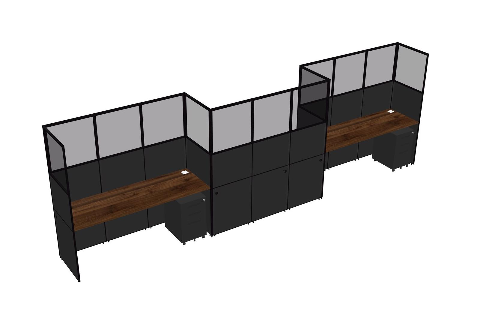 Columbia Walnut Rectangular Cubicle Workstations For 3 - Zigzag Formation + Black Metal Mobile Drawers