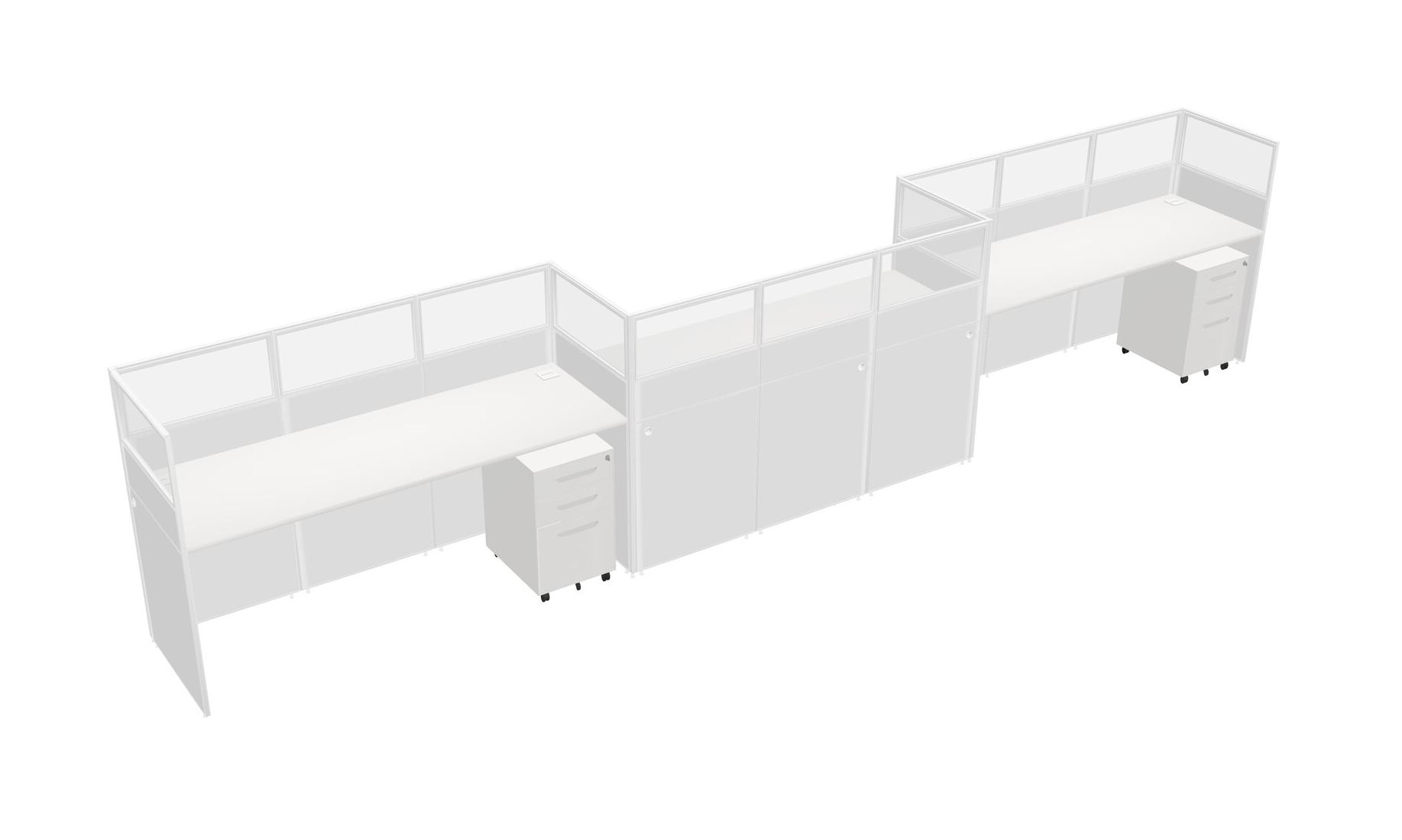 White Rectangular Cubicle Workstations For 3 - Zigzag Formation + White Metal Mobile Drawers