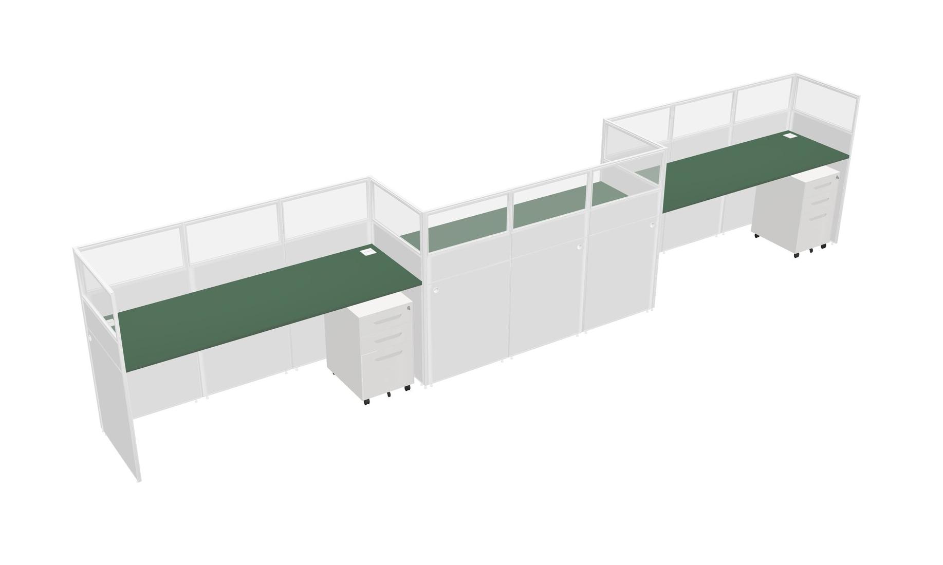 Green Rectangular Cubicle Workstations For 3 - Zigzag Formation + White Metal Mobile Drawers