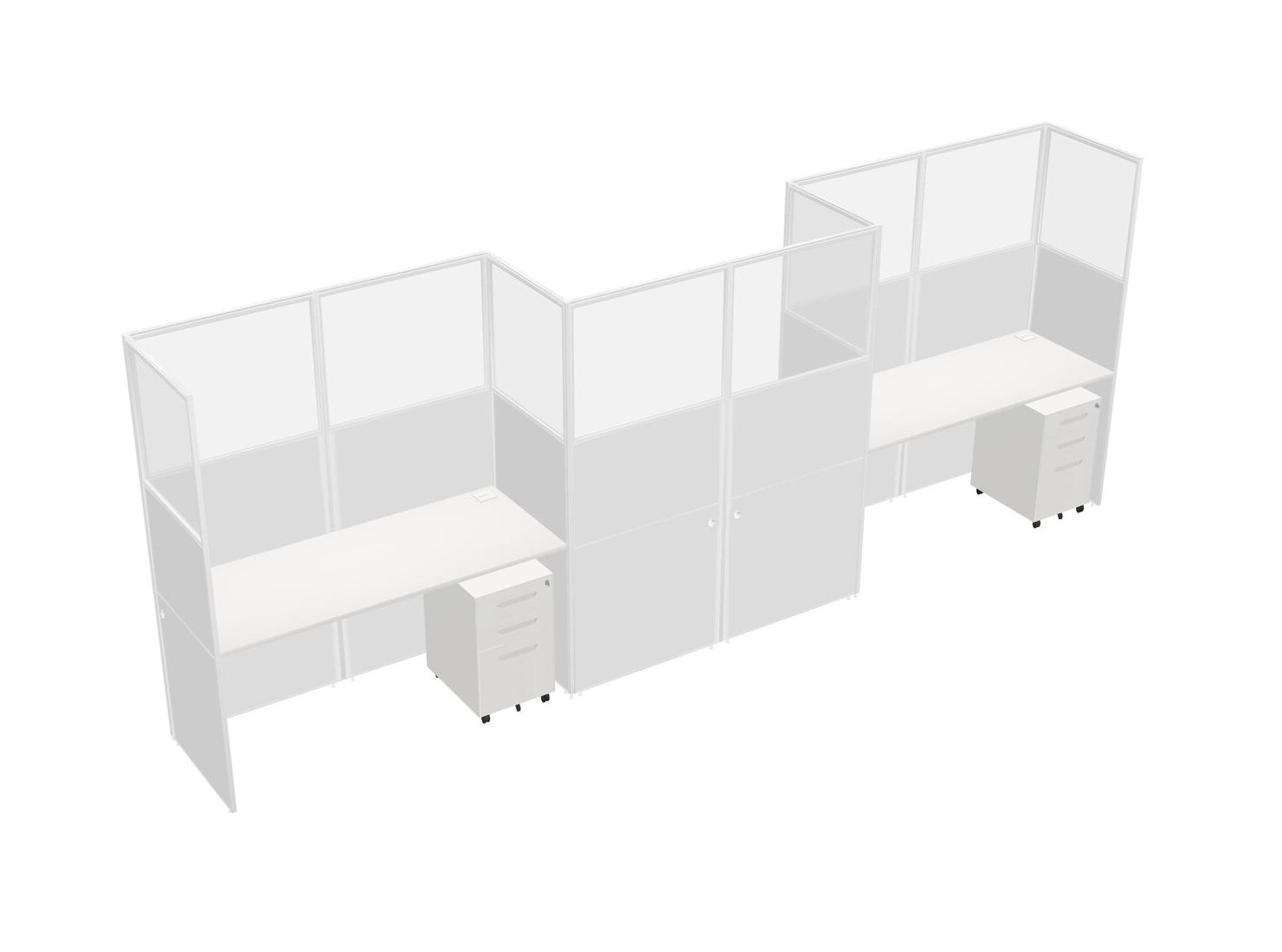 White Rectangular Cubicle Workstations For 3 - Zigzag Formation + White Metal Mobile Drawers