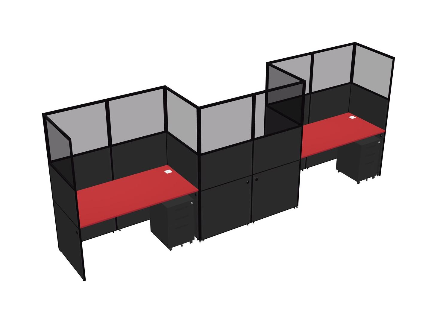 Prism Red Rectangular Cubicle Workstations For 3 - Zigzag Formation + Black Metal Mobile Drawers