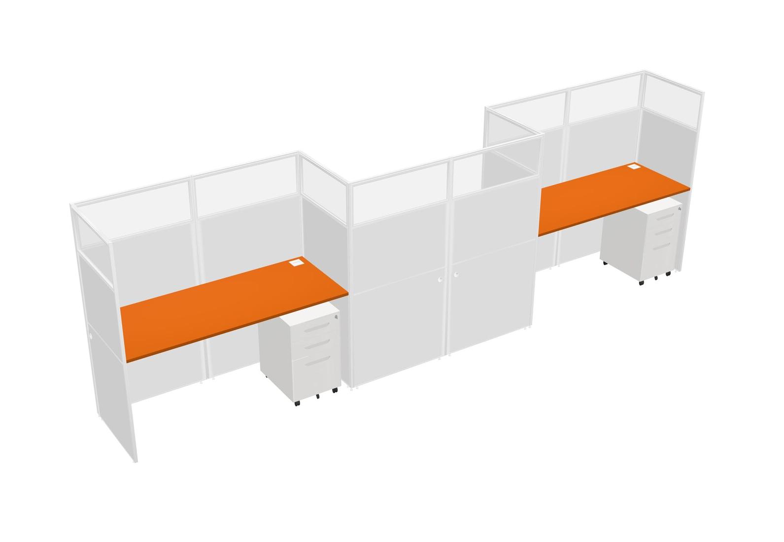 Orange Rectangular Cubicle Workstations For 3 - Zigzag Formation + White Metal Mobile Drawers