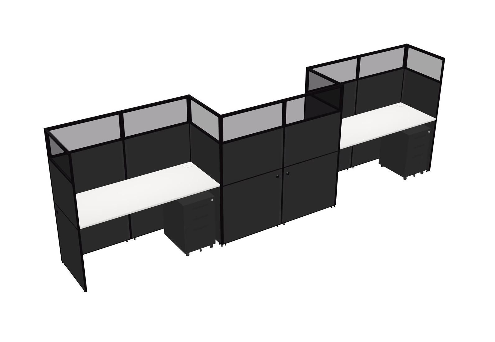 White Rectangular Cubicle Workstations For 3 - Zigzag Formation + Black Metal Mobile Drawers