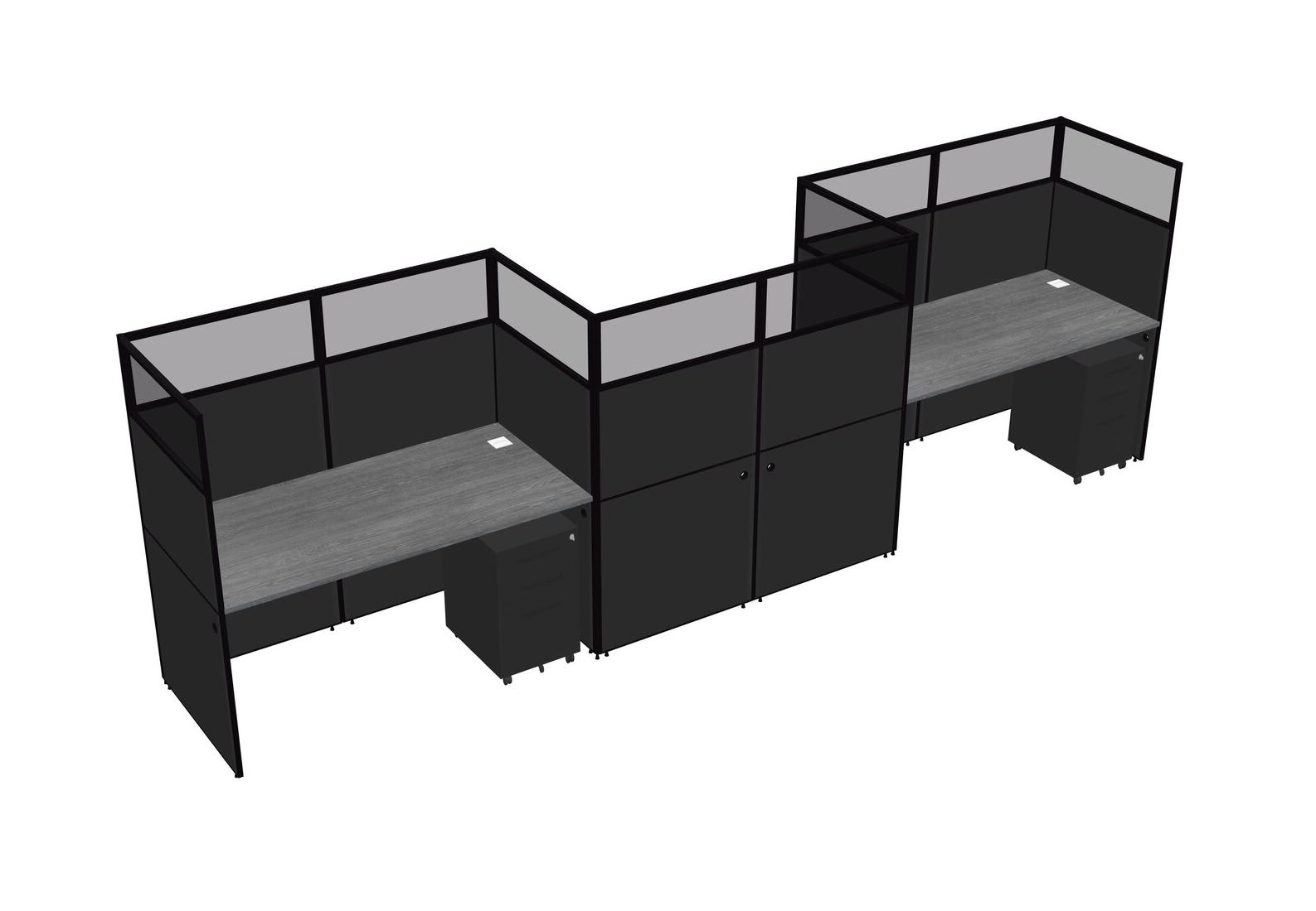 Grey Rectangular Cubicle Workstations For 3 - Zigzag Formation + Black Metal Mobile Drawers