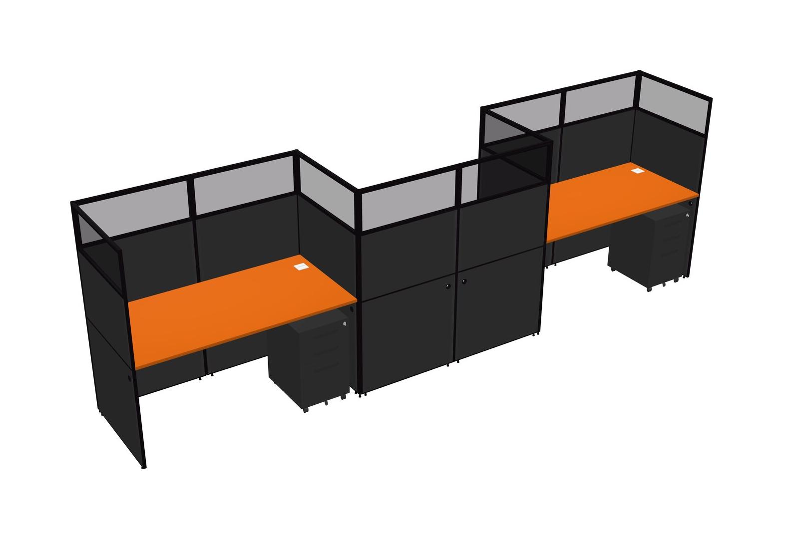 Orange Rectangular Cubicle Workstations For 3 - Zigzag Formation + Black Metal Mobile Drawers