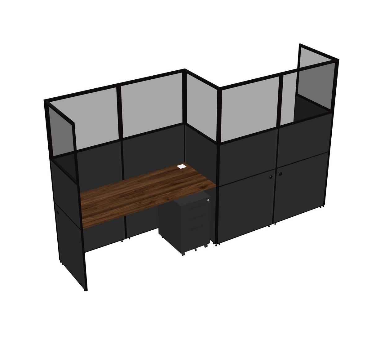 Columbia Walnut Rectangular Cubicle Workstations For 2 - Zigzag Formation + Black Metal Mobile Drawers