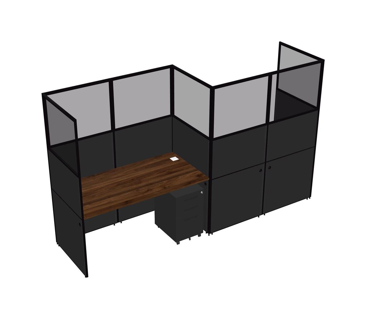 Columbia Walnut Rectangular Cubicle Workstations For 2 - Zigzag Formation + Black Metal Mobile Drawers