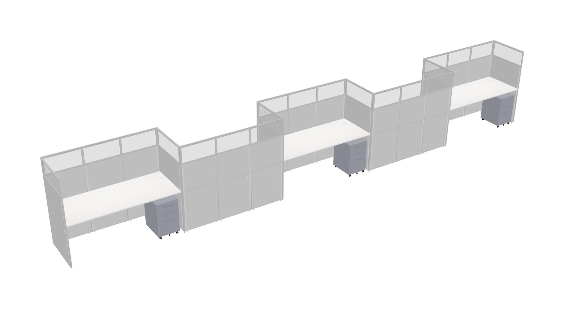 White Rectangular Cubicle Workstations For 5 - Zigzag Formation + Grey Metal Mobile Drawers