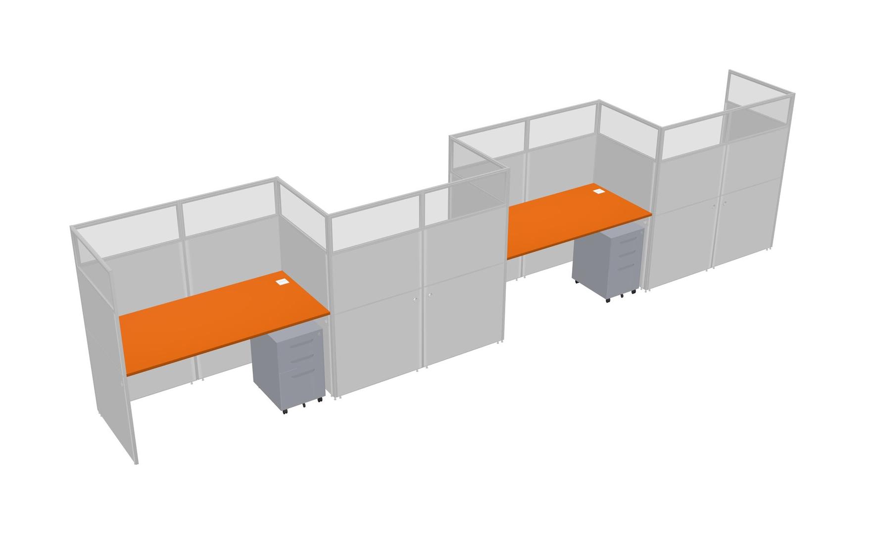 Orange Rectangular Cubicle Workstations For 4 - Zigzag Formation + Grey Metal Mobile Drawers