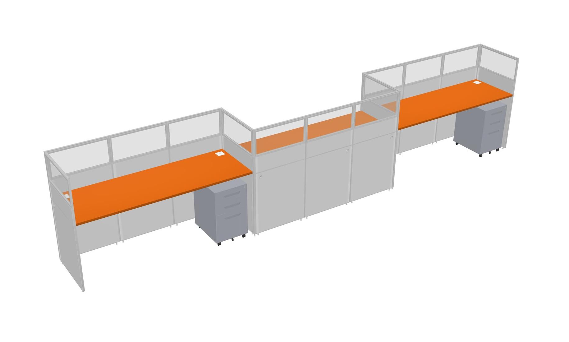 Orange Rectangular Cubicle Workstations For 3 - Zigzag Formation + Grey Metal Mobile Drawers