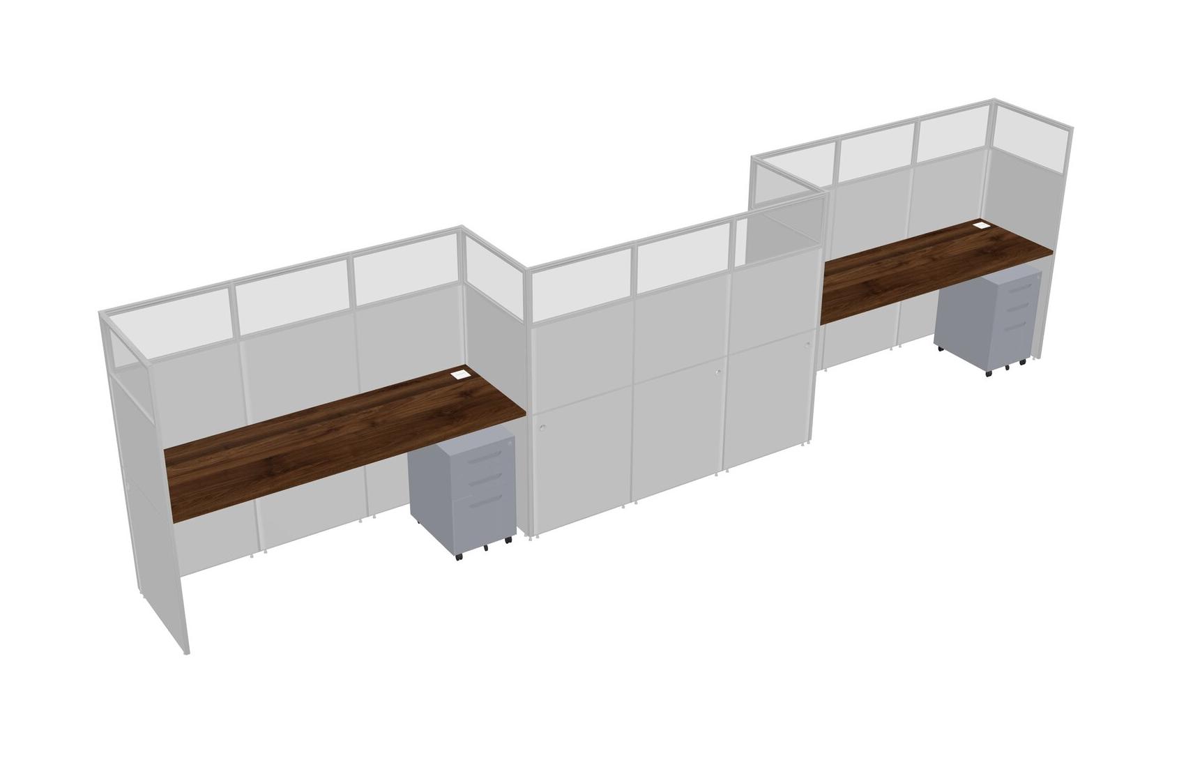 Columbia Walnut Rectangular Cubicle Workstations For 3 - Zigzag Formation + Grey Metal Mobile Drawers