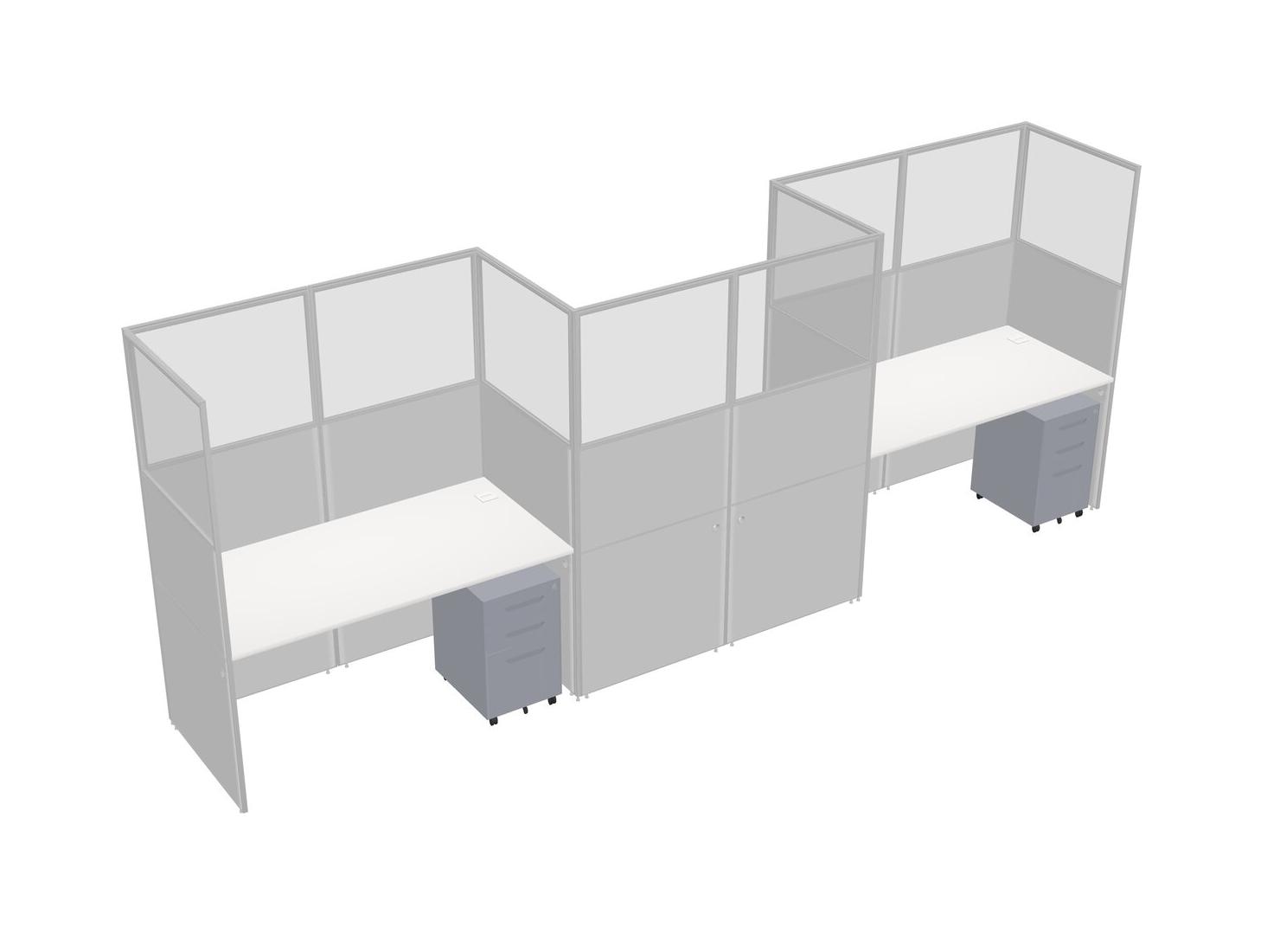 White Rectangular Cubicle Workstations For 3 - Zigzag Formation + Grey Metal Mobile Drawers
