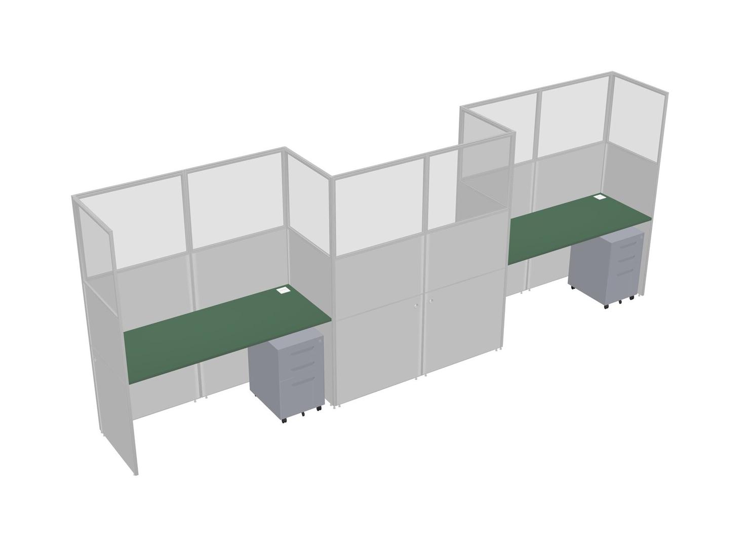 Green Rectangular Cubicle Workstations For 3 - Zigzag Formation + Grey Metal Mobile Drawers