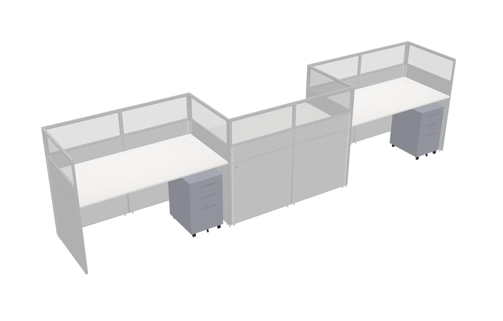 White Rectangular Cubicle Workstations For 3 - Zigzag Formation + Grey Metal Mobile Drawers