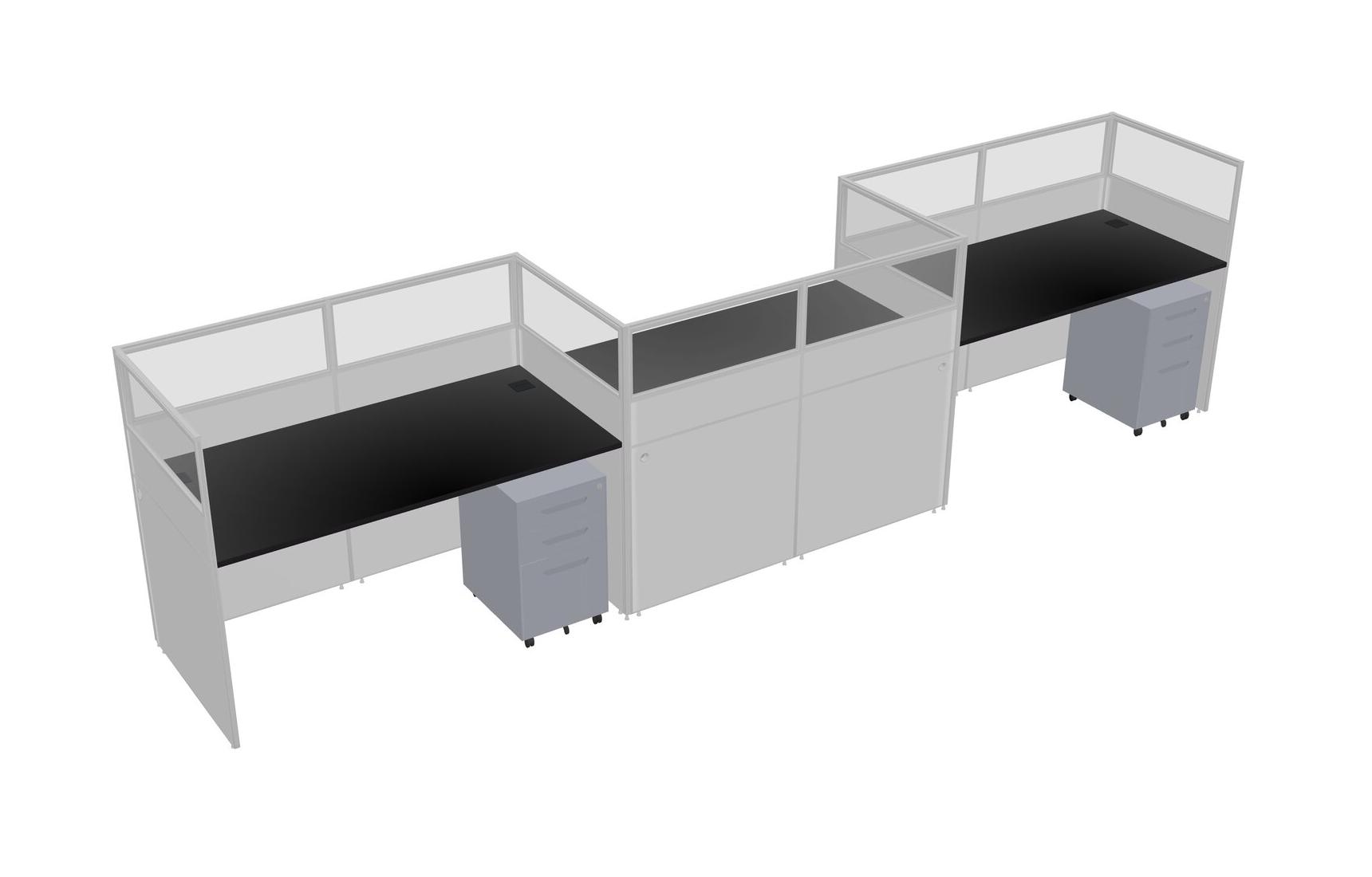 Black Rectangular Cubicle Workstations For 3 - Zigzag Formation + Grey Metal Mobile Drawers