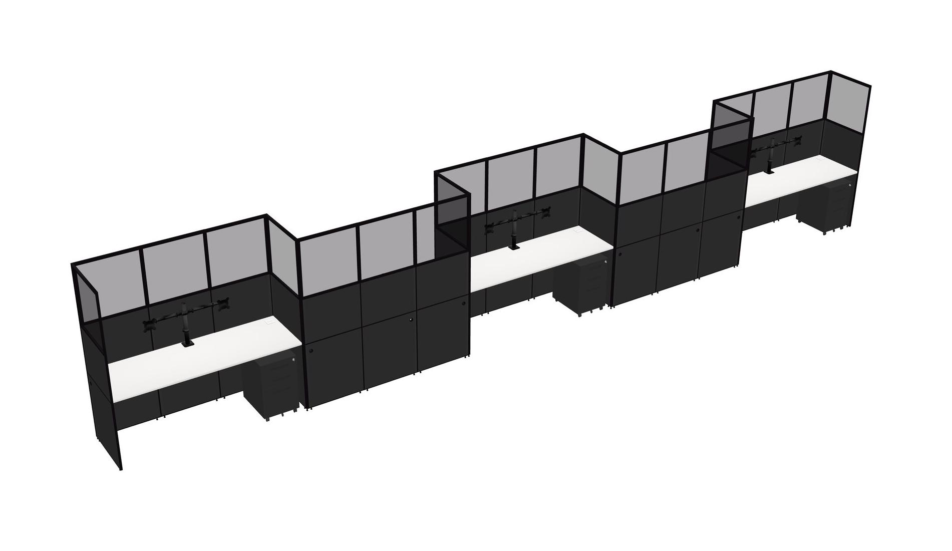 White Rectangular Cubicle Workstations For 5 - Zigzag Formation + Black Metal Mobile Drawers