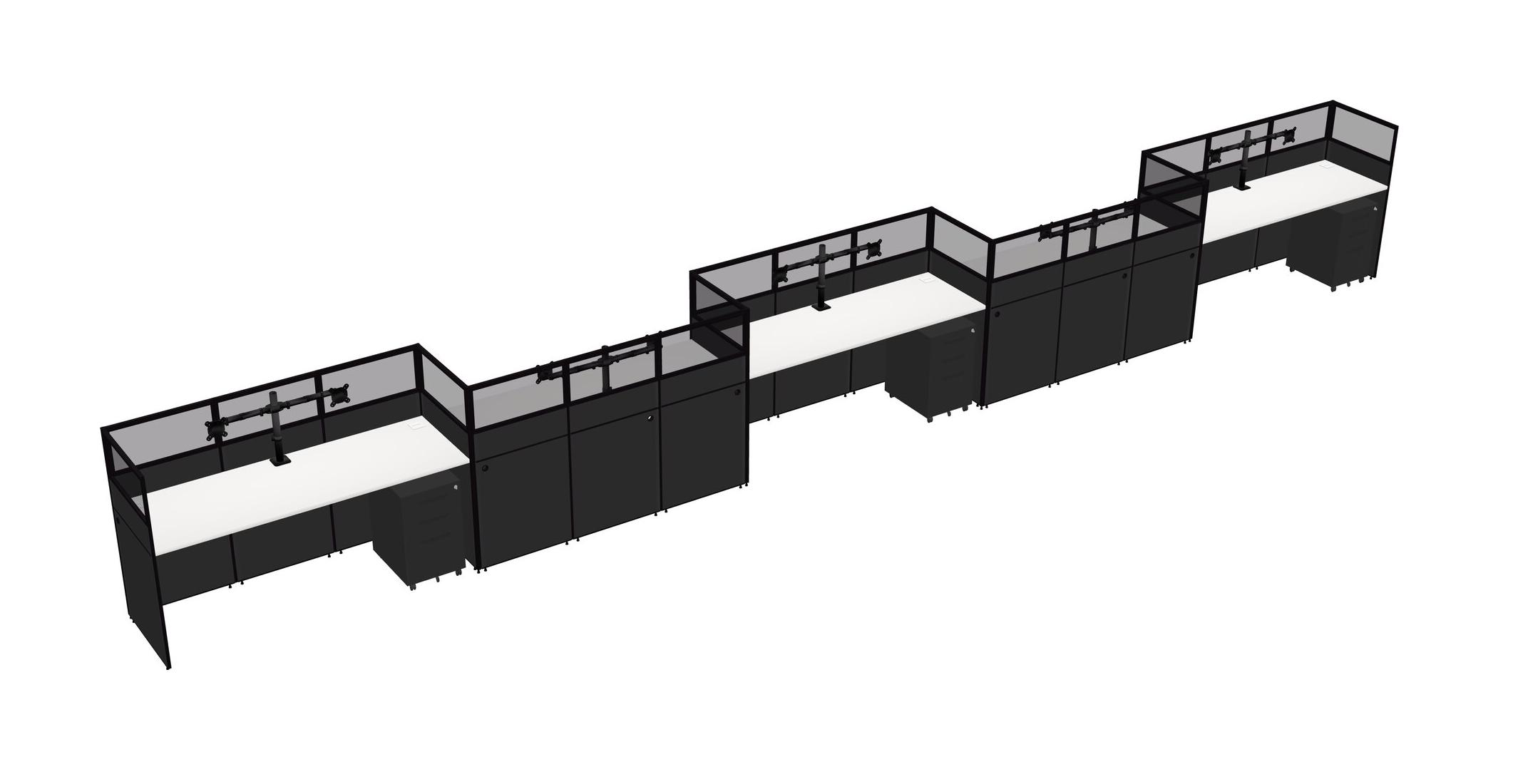 White Rectangular Cubicle Workstations For 5 - Zigzag Formation + Black Metal Mobile Drawers