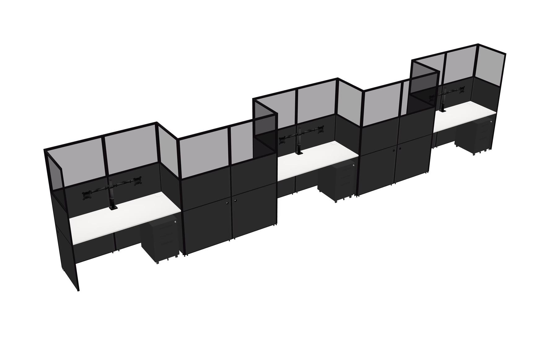 White Rectangular Cubicle Workstations For 5 - Zigzag Formation + Black Metal Mobile Drawers