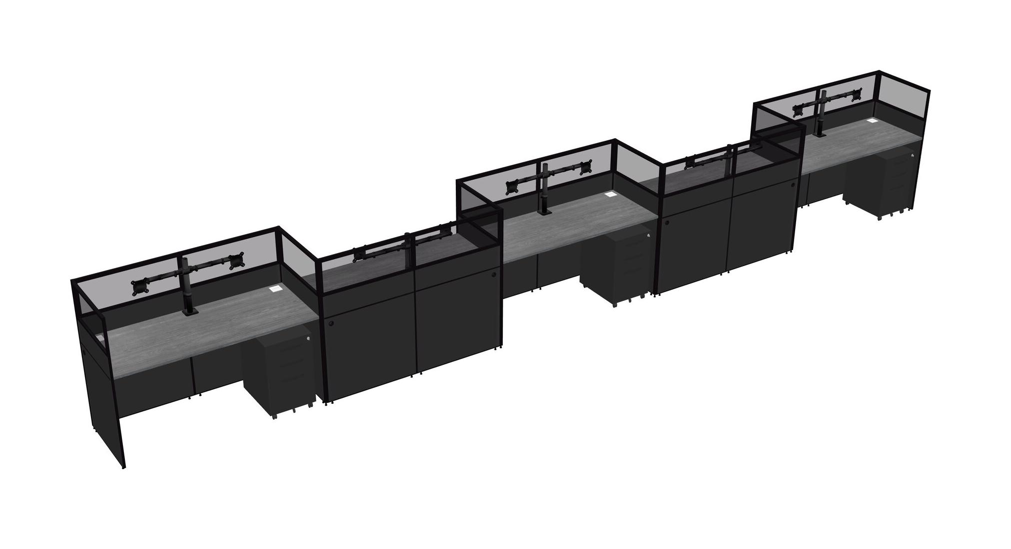 Grey Rectangular Cubicle Workstations For 5 - Zigzag Formation + Black Metal Mobile Drawers