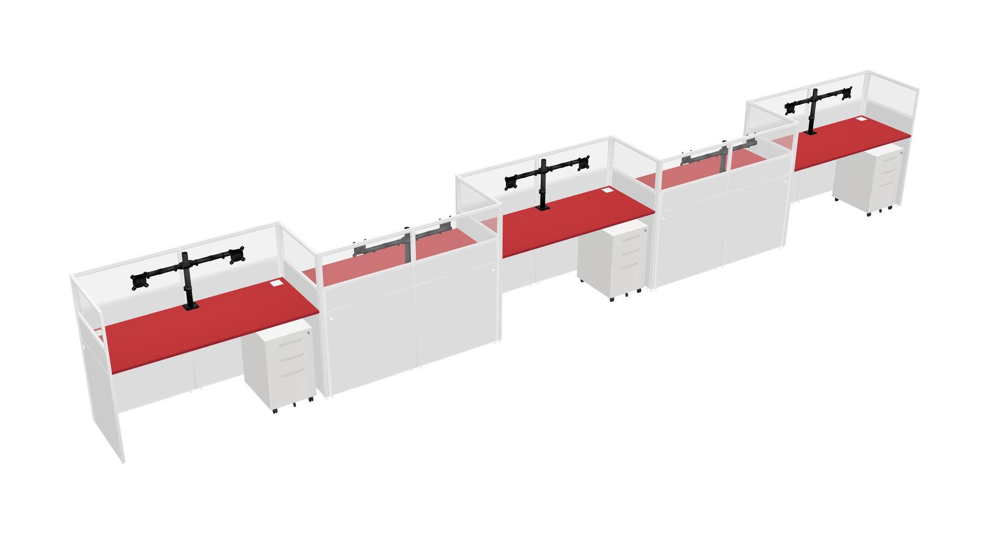 Prism Red Rectangular Cubicle Workstations For 5 - Zigzag Formation + White Metal Mobile Drawers