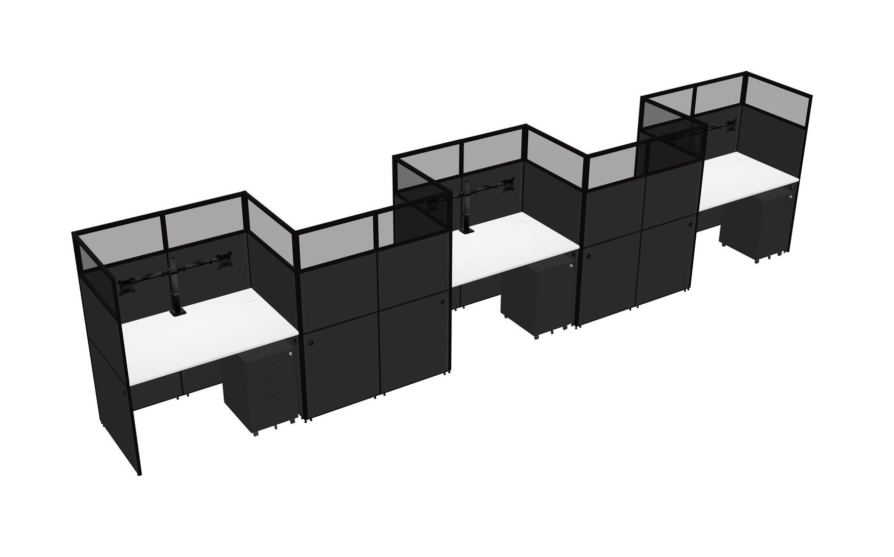 White Rectangular Cubicle Workstations For 5 - Zigzag Formation + Black Metal Mobile Drawers