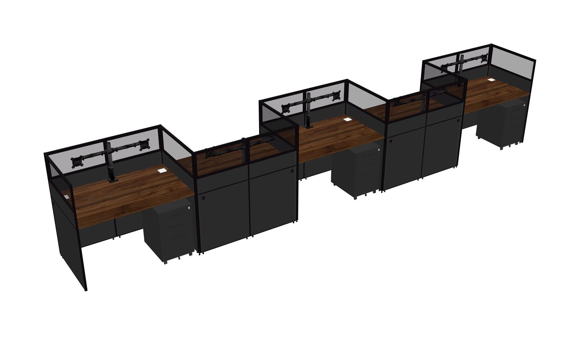Columbia Walnut Rectangular Cubicle Workstations For 5 - Zigzag Formation + Black Metal Mobile Drawers