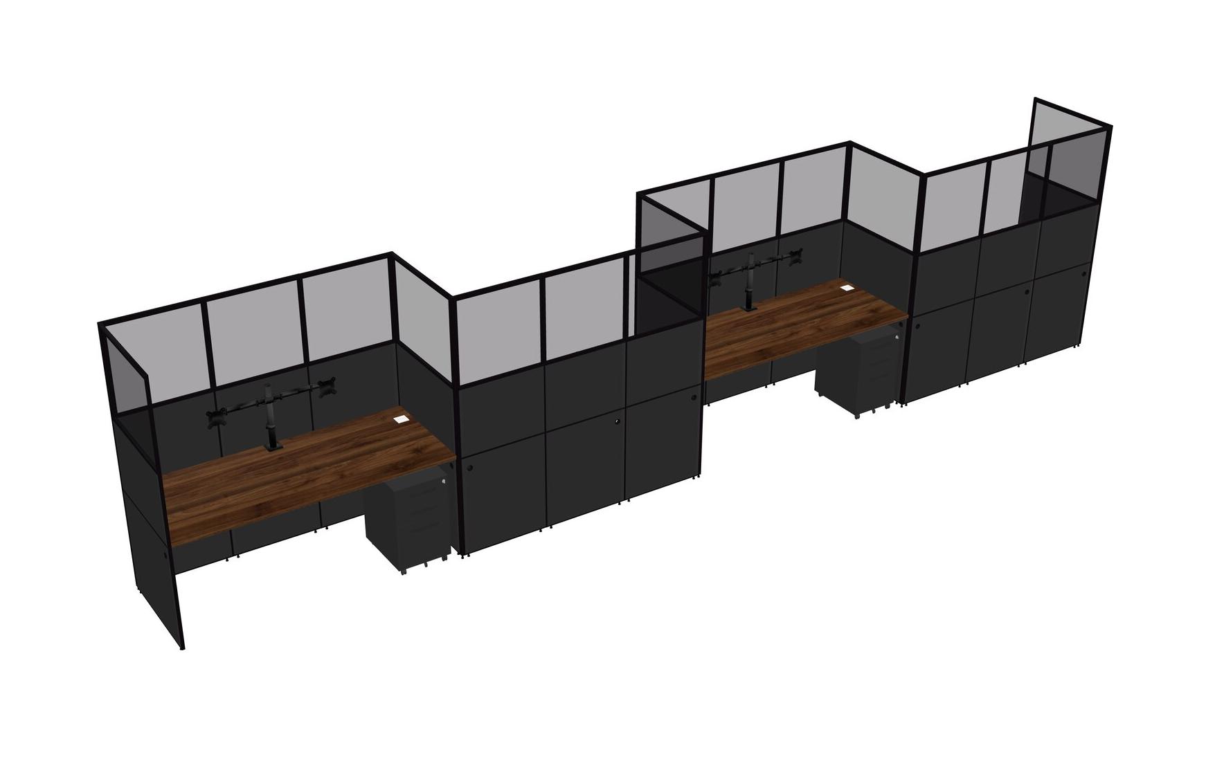 Columbia Walnut Rectangular Cubicle Workstations For 4 - Zigzag Formation + Black Metal Mobile Drawers