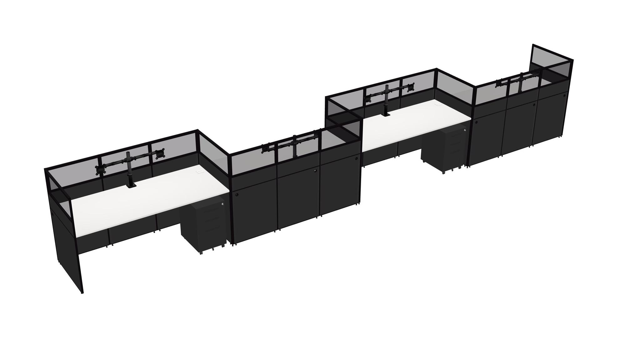 White Rectangular Cubicle Workstations For 4 - Zigzag Formation + Black Metal Mobile Drawers