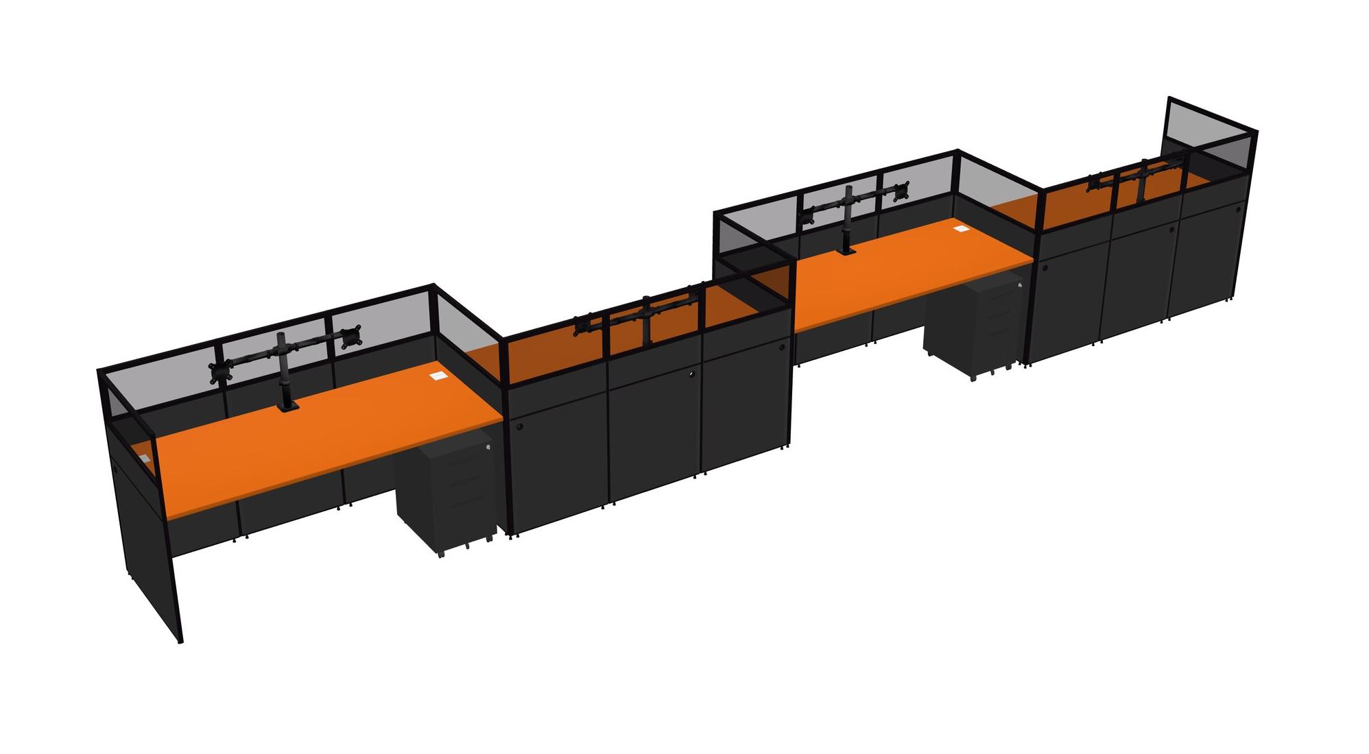 Orange Rectangular Cubicle Workstations For 4 - Zigzag Formation + Black Metal Mobile Drawers