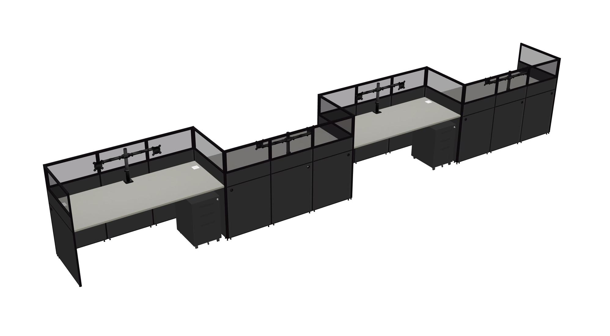 Grey Shadows Rectangular Cubicle Workstations For 4 - Zigzag Formation + Black Metal Mobile Drawers