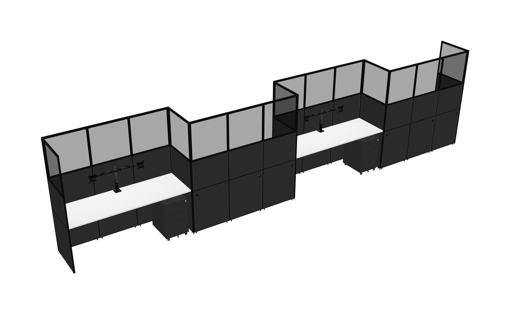 White Rectangular Cubicle Workstations For 4 - Zigzag Formation + Black Metal Mobile Drawers