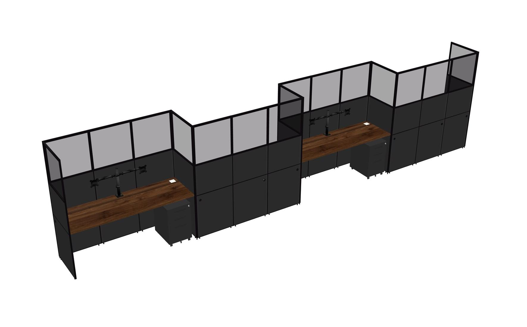 Columbia Walnut Rectangular Cubicle Workstations For 4 - Zigzag Formation + Black Metal Mobile Drawers
