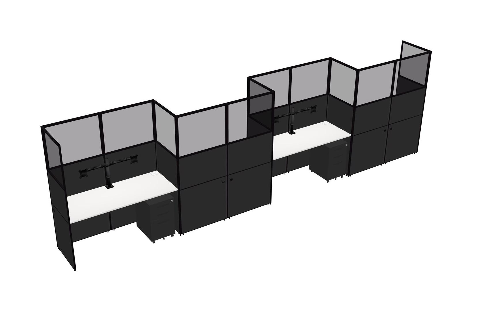 White Rectangular Cubicle Workstations For 4 - Zigzag Formation + Black Metal Mobile Drawers