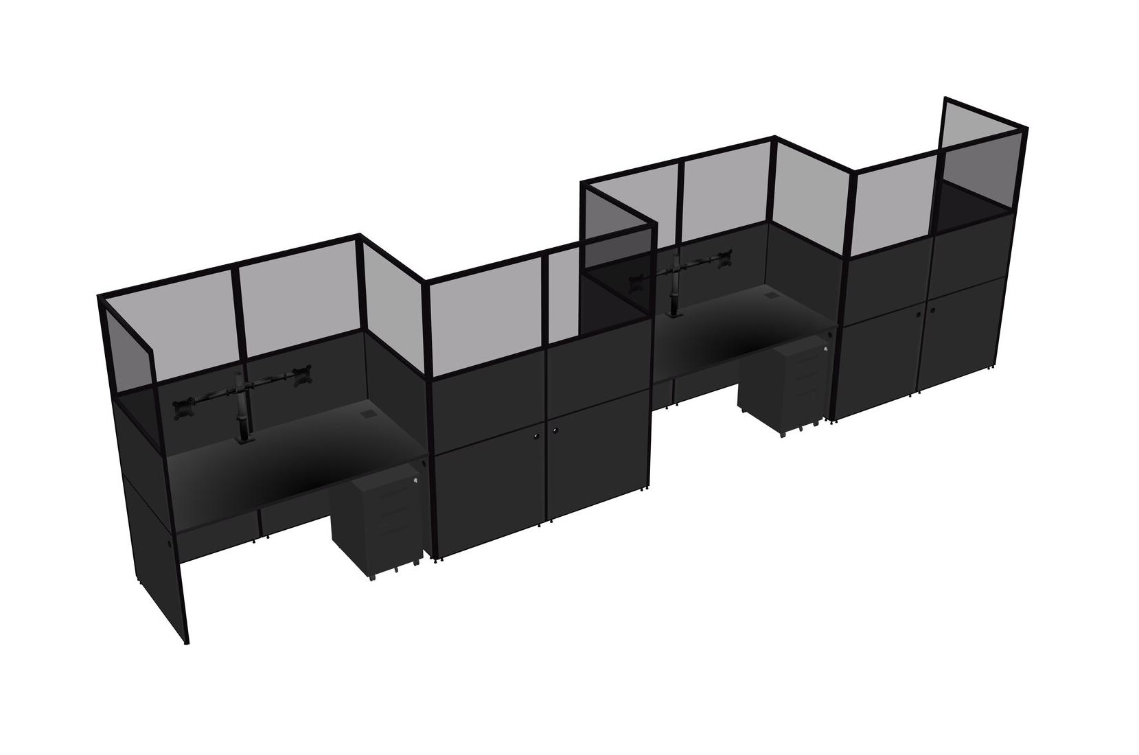 Black Rectangular Cubicle Workstations For 4 - Zigzag Formation + Black Metal Mobile Drawers