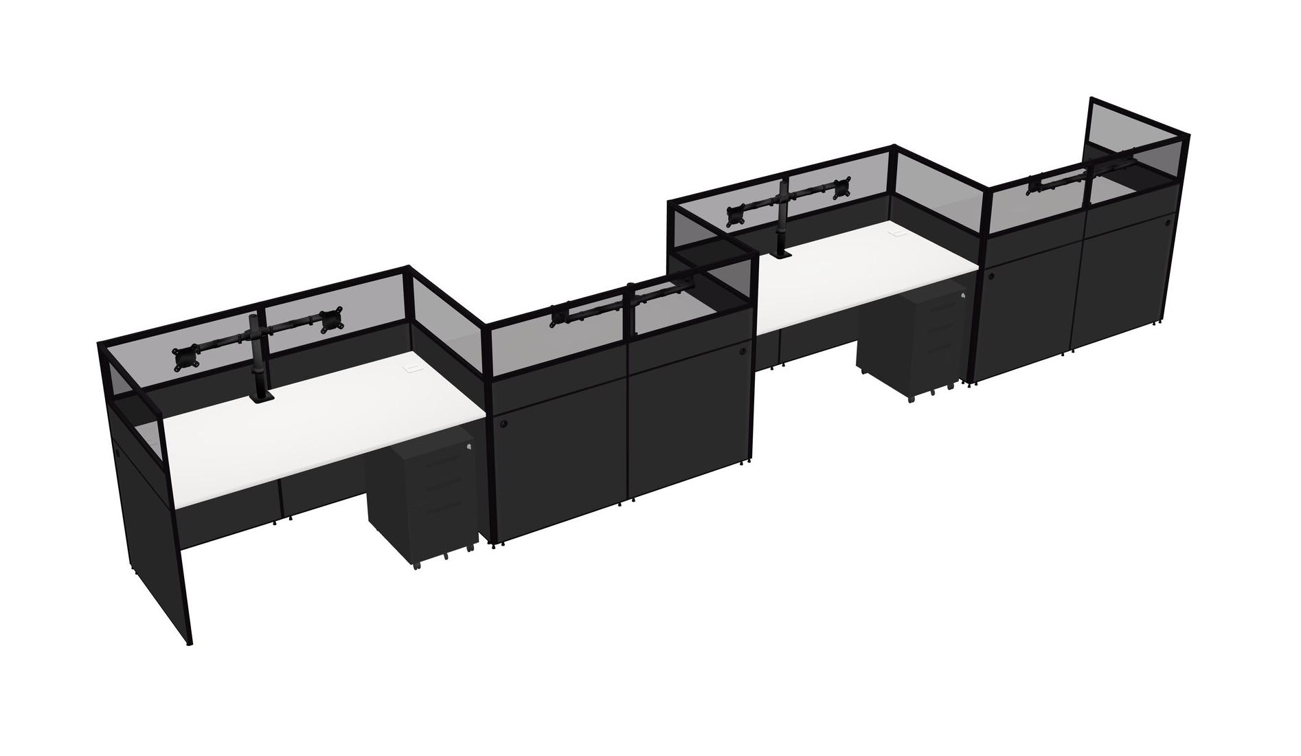 White Rectangular Cubicle Workstations For 4 - Zigzag Formation + Black Metal Mobile Drawers