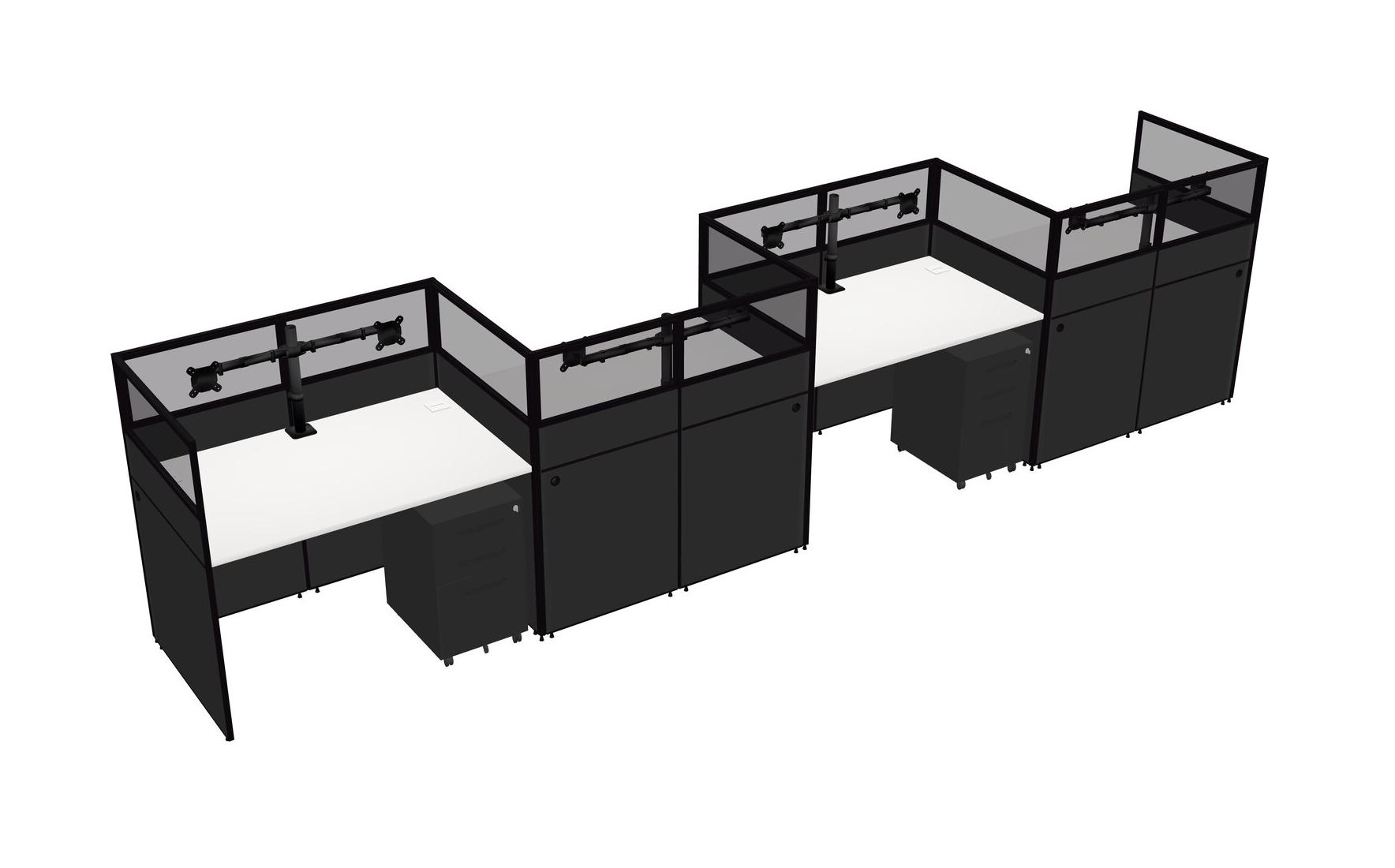 White Rectangular Cubicle Workstations For 4 - Zigzag Formation + Black Metal Mobile Drawers