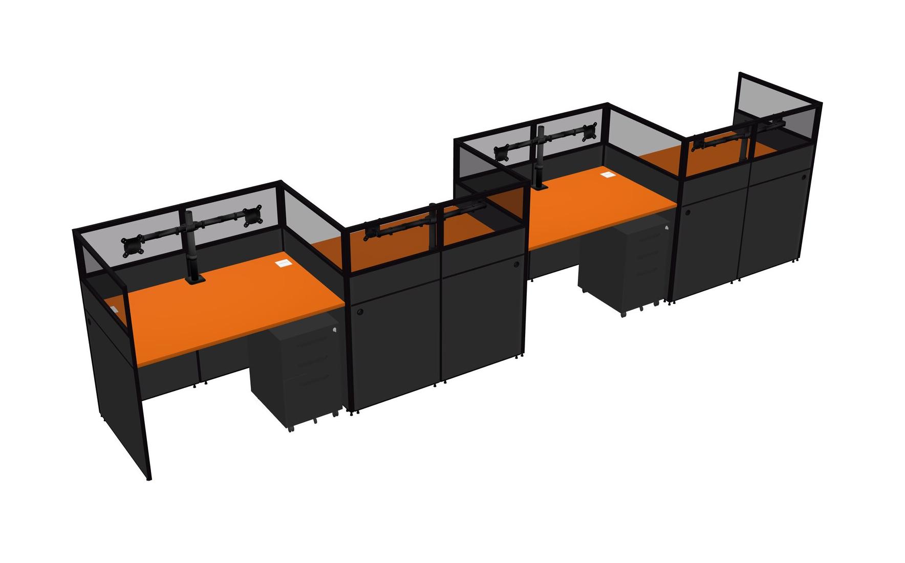 Orange Rectangular Cubicle Workstations For 4 - Zigzag Formation + Black Metal Mobile Drawers