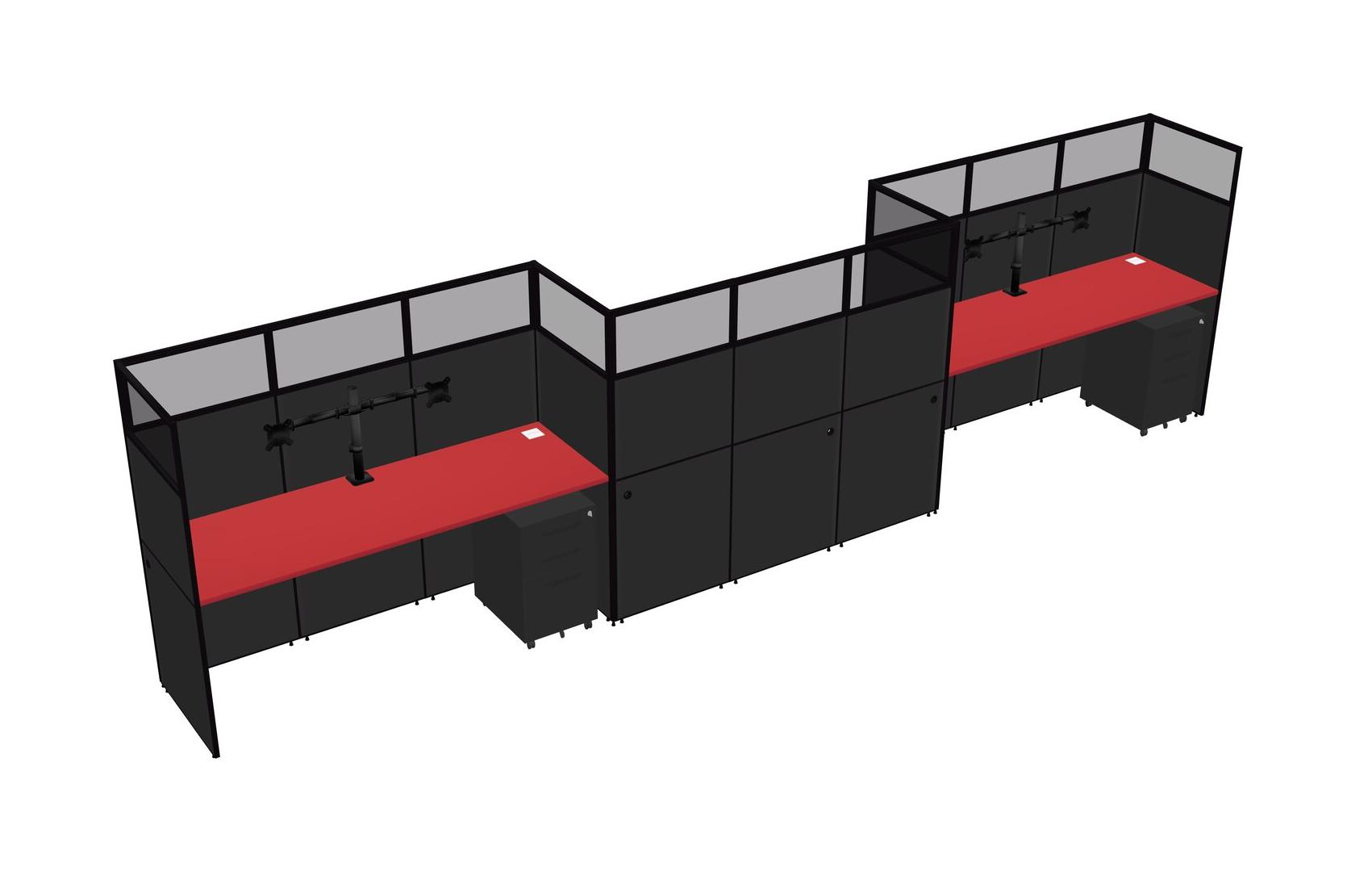 Prism Red Rectangular Cubicle Workstations For 3 - Zigzag Formation + Black Metal Mobile Drawers