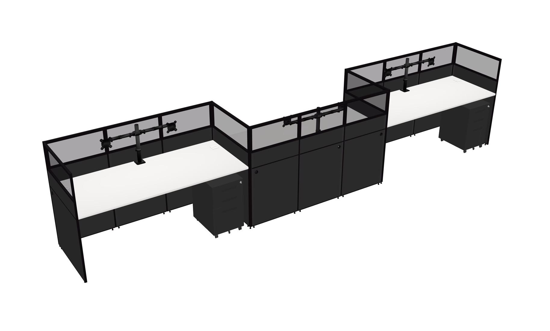 White Rectangular Cubicle Workstations For 3 - Zigzag Formation + Black Metal Mobile Drawers