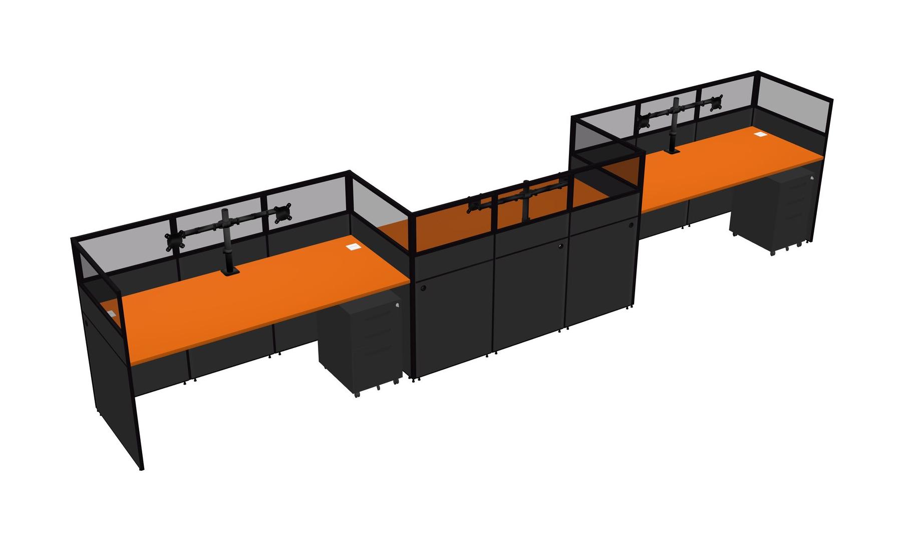Orange Rectangular Cubicle Workstations For 3 - Zigzag Formation + Black Metal Mobile Drawers