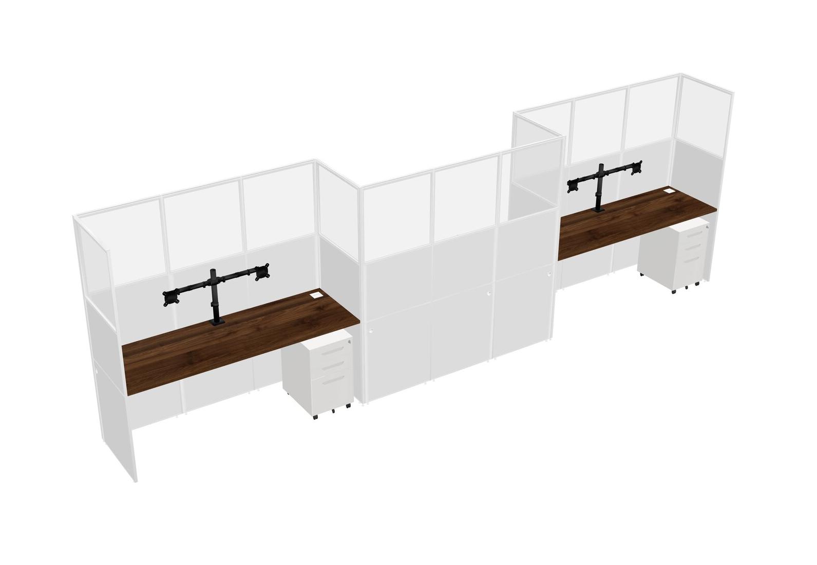 Columbia Walnut Rectangular Cubicle Workstations For 3 - Zigzag Formation + White Metal Mobile Drawers