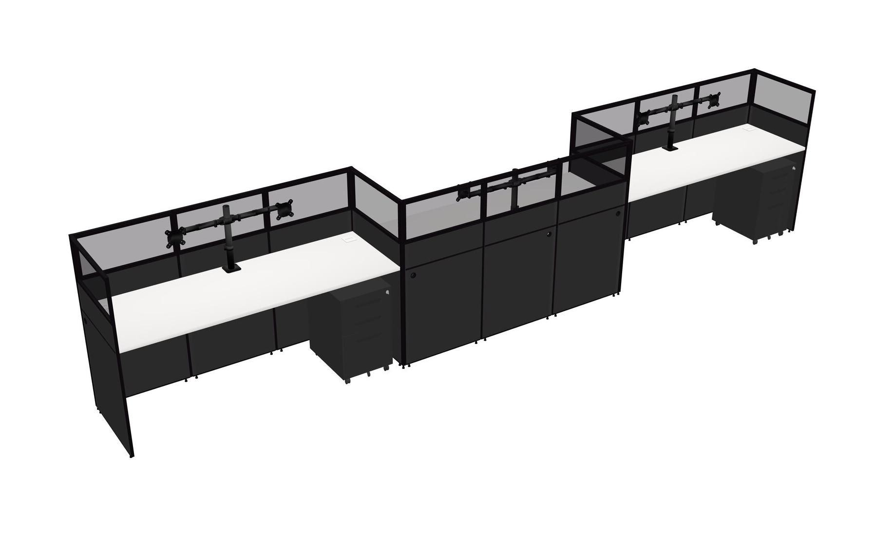 White Rectangular Cubicle Workstations For 3 - Zigzag Formation + Black Metal Mobile Drawers