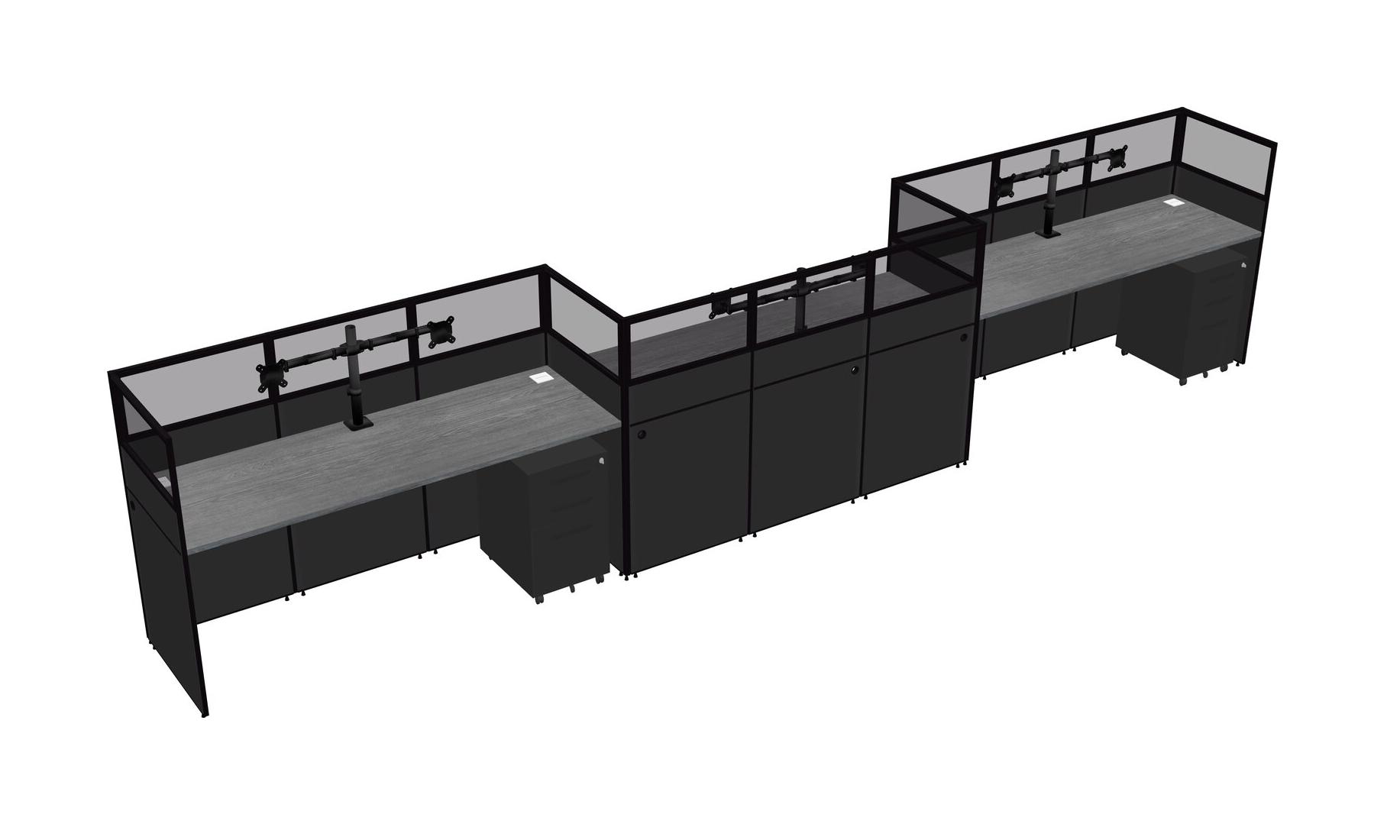 Grey Rectangular Cubicle Workstations For 3 - Zigzag Formation + Black Metal Mobile Drawers
